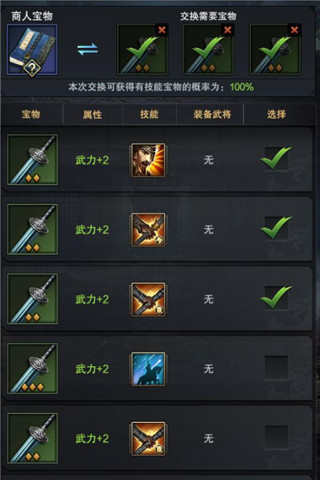 经过本小编多次实验结果,刷商船换宝物确实能变废为宝,而且存在技巧。部分宝物以三换一进行升阶,想要换回来的高级宝物带着有用的技能,可以用三个低级带有技能的宝物换。三个有技能的,必能换出一件带技能的。两件有技能,一件没有技能的,换出来的宝物带技能的概率高,但并不是百分百的。部分宝物一对一换取,这个用有技能的也必定换有技能的,主公可以利用这样的交换将自己不需要的技能尝试换成其他技能,或者换成其他种类的宝物。这个技巧,主公们都可以利用来换取心仪的宝物哦!
