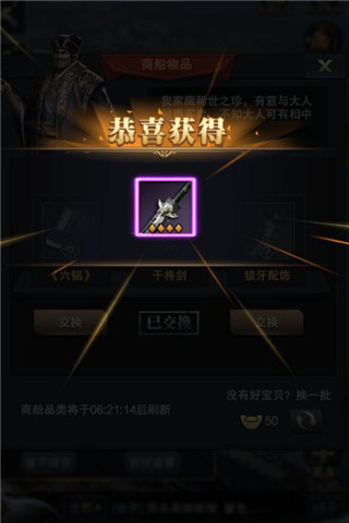 珍宝阁需要各位主公利用最好的魅力武将去寻宝,才能获得上乘宝物,如有武将大乔,配上赤兔,那更是如虎添翼!但宝物的品级,与寻宝的武将有相关之外,还是要看主公们是否脸白,非酋若是一直寻得蓝阶以下的宝物,肯定苦恼不堪!但是,主公们发现没有,商船有交换宝物的功能,而且低级还能替换成高级的,没技能的能替换有技能的,这不正是一个将废柴变成一个有用宝物的机会吗?