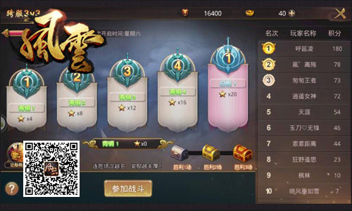 江湖之中高手配美人,正如杨过配小龙女,令狐冲配任盈盈……玩家在冰河《风云志》中也可与自己的小伙伴组成三人战队,公共挑战跨服3V3竞技玩法!游戏中,玩家组建战队后,将随机匹配到任意服务器的玩家队伍,成功3分钟通过争夺能量塔、击杀敌方成员获取积分较高的一方即可获胜,每名成员均可累计海量积分并获得功勋值奖励哦!