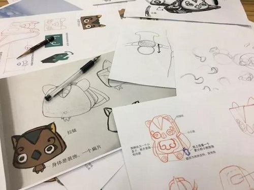 确立设计的主线思路后,就需决定周边的具体样式和类型。经过一番调研,设计师们将目标锁定在日常方便使用的物件上,结合设计可实现的程度,最终通过了泰吉玩偶主题背包以及手账本的提案。之后,项目组绘制了大量的手稿进行对比。从风格到细节,又经历了很长一段时间的揣摩尝试。手稿经历了高达30多次的修改才最终敲定,设计师们早已哭晕在厕所中。