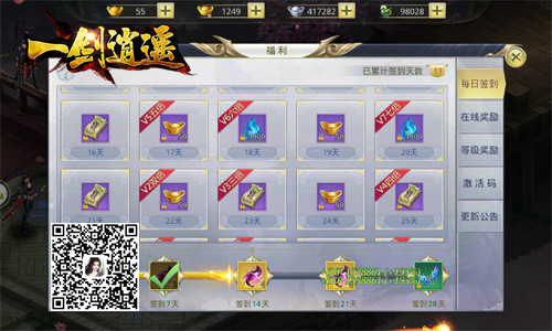 冬天不止火锅与酒,更有海量元宝、银票每日可领哦!在冰河《一剑逍遥》中,玩家登录游戏签到即可免费领取各类暖心奖励,每日各类道具轻松领取绝不重样。连续签到2、7、14等天数更可额外获得高级圣令提升石、六阶羽翼等高级奖励!如果玩家已经成为VIP,更可在特定天数领取多倍道具奖励哦!