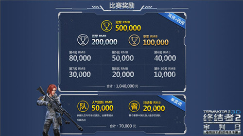 前三名的奖金更为诱人,其中季军奖励100000元,亚军奖励200000元,最强的冠军也可以独揽500000元重奖!
