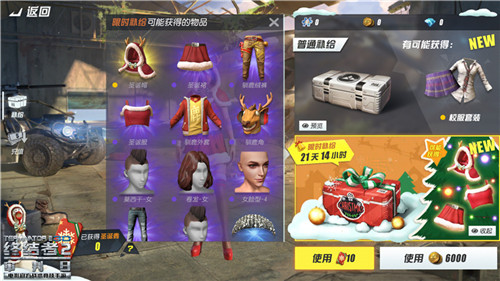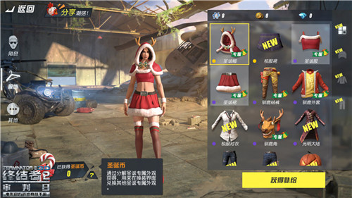 圣诞新版暖心上线,全新圣诞补给大礼包上架,有机会开出专属圣诞时装,鲜艳的大红主色调,精致的造型,厚实的绒毛,和你的终结者战士肯定很搭!驯鹿套装主打随性风,不仅保暖效果一流,还具备街头嘻哈元素,在战斗中十分舒适便利。圣诞套装主打小性感,裹胸、短裙、过膝袜加小高跟的搭配,绝对回头率爆表!
