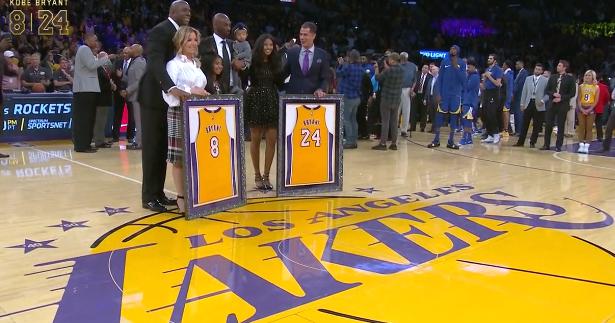 在湖人主场迎战勇士的中场时间,万众期待的科比双球衣退役仪式来临,见证飞侠20载紫金荣耀的8号与24号球衣双双被升到斯台普斯球馆上空,与魔术师约翰逊、天勾贾巴尔等队史伟大球星并列,无疑也彰显科比的伟大。