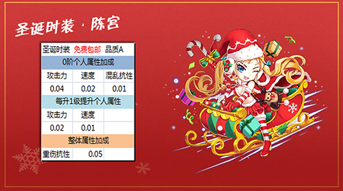 《挂机吧主公》手游圣诞时装不仅华丽漂亮,还充满了了欢乐元素。免费包邮???单单名字就已经萌哭了,加上与这个名字气质相符的A级品质,陈宫本色出演圣诞老人一角色。当然,混乱抗性、重伤抗性的加成也是不错~