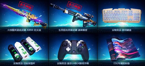 除此之外,总决赛直播过程中,还有额外的奖品等你来抢!在赛事直播期间每场赛事结束后,根据主播提示,在直播画面中将为观众发放礼品兑换码。将兑换码输入到PC直播专题页兑换框中,就可以兑换对应的奖品啦!奖品包括火线精英或生死狙击永久神器、游戏键盘、豆娃保温杯、盖世小鸡G4游戏手柄、ESG定制鼠标垫哦!不过,这是一个拼手速的游戏,手快有,手慢无!(PS:生死狙击、火线精英永久武器需在游戏中进行兑换)