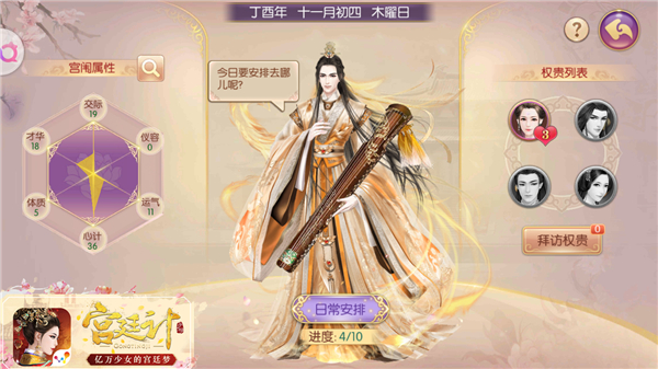 《宫廷计》手游的宫闱录开放意味着小伙伴们可以主动与权贵们多多联系,逐渐与各位权贵增强联系,建立靠谱的后宫关系网,能提升自己在宫廷中的宫斗实力,也能收获一段难能可贵的缘分和友谊,谁说后宫之中没有真情实意,宫闱录上的权贵都精挑细选的好相处的人儿。