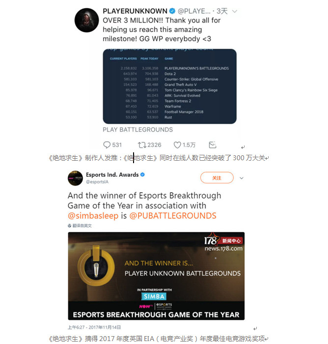 《绝地求生》在全球市场现象级的火爆表现和优秀的游戏品质,也让其横扫了2017G-STAR包括最高奖项“总统奖”在内的六大奖项。还以黑马姿态入围steam最畅销游戏铂金级、最热新品、最佳抢先体验毕业游戏铂金级和最高人气游戏铂金级四个奖项。《绝地求生》还摘得2017EIA年度最佳电竞游戏奖。