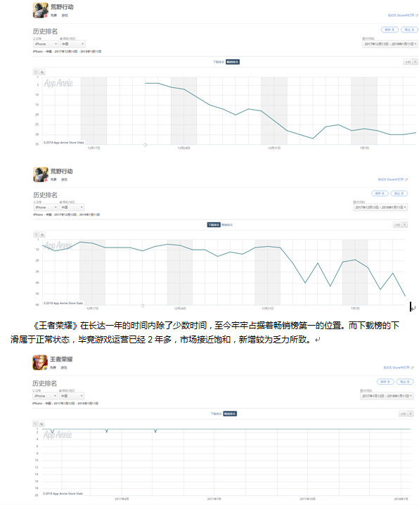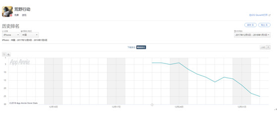 首先是App Annie提供的四款游戏畅销榜数据对比,可以看到《荒野行动》自12月20日加入商业化收费项目起,仅一天时间占据过第四的位置,之后总体呈滑落趋势,在30名上下不断徘徊。