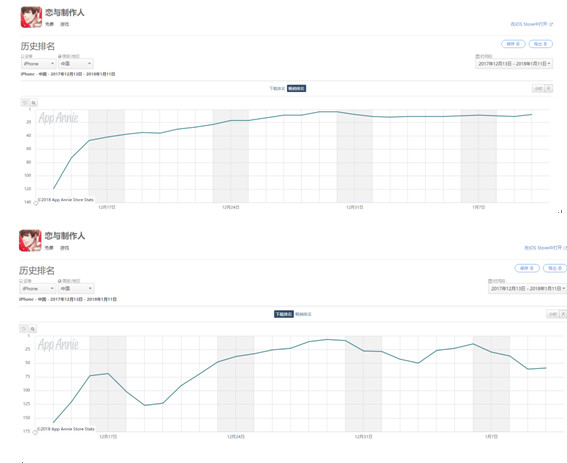 而乙女向游戏《恋与制作人》,最初虽在100名开外,但因为其不错的游戏素质广受玩家赞扬,因此排名曲线呈逐渐上升趋势,并在随后保持住了目前的优势排名。