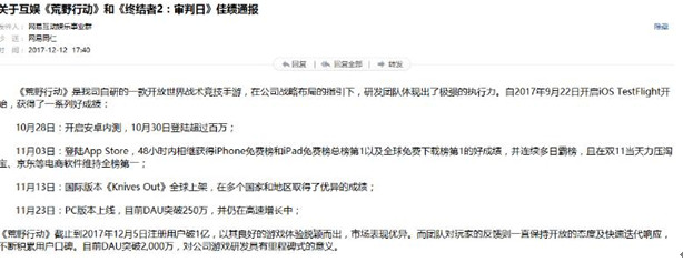 在去年12月中旬,一份网易内部的表扬信在网上广为流传,信中宣称《荒野行动》仅在一个月时间就取得了了2000万DAU的好成绩,并在12月5日注册用户突破了1亿人。
