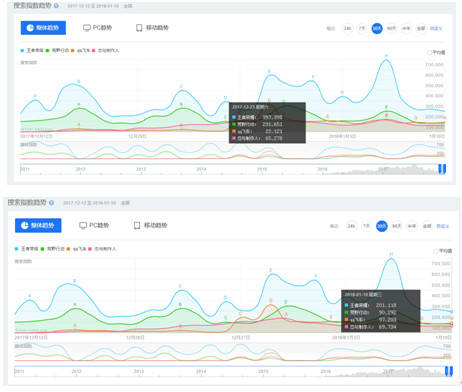 众所周知,一款游戏在百度中的搜索次数,可以作为这款游戏受欢迎程度和玩家口碑的缩影。下面我们再通过百度指数来管中窥豹,看看这四款游戏依次在玩家中的地位如何。