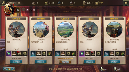 接受国家任务后,如果觉得完成不了,例如缺少资源或没有空闲部队可以派遣等,玩家还可以将接取的任务委托出去,委托的任务可以被本势力的其他玩家接取,完成后双方都能获得奖励。内政类任务消耗政令,战斗类任务消耗军令,政令与军令通过官职俸禄领取,也可以在商店购买。完成国家任务可以提升玩家与武将等级,还能提升官职,是玩家前期提升实力的主要途径。