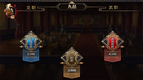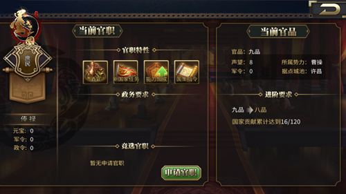 获得贡献后,玩家就可以凭贡献提升官品啦。官品从九品一直到一品,越高可以解锁更多部队,每日俸禄也越高。官职分为文职和武职,对应九级官品,文职为县尉、辅丞、侍御史、郡史、御史大夫、九辅、中书令、九卿、丞相;武职为散骑、校尉、偏将军、领军、平定将军、征伐将军、中将军、镇国将军、大将军。不同官职效果不同,包括但不限于提升武将属性,资源产出量等效果,玩家可以根据需要选择自己喜欢的官职。