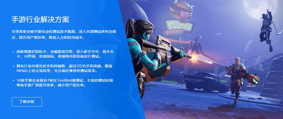 TestBird是全球第一家攻克手游自动化测试技术的厂商,并连续5年推出针对手游行业的测试产品,包括标准兼容性测试、远程真机调试、压力测试等热门“刚需”产品,深受广大手游开发者的信赖,并被国内游戏企业所熟知。有数据统计,国内每十家游戏企业就有7家在TestBird做测试。