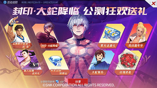 值得一提的还有,在公测活动“大蛇复苏”中,初始使用格斗家克里斯达到一定击杀数可以领取复苏礼包,并在接下来的战斗中变成封印?大蛇,用封印?大蛇并达到一定击杀数则可领取命炎天王礼包,使用后将有机会获得全新的秘笈“暗炎爆”,敬请期待!