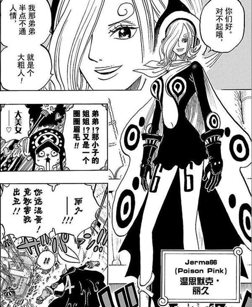 而丽久则是温思默克家族的长女,也是山智的姐姐。她在826话中登场,因为杰尔马高科技赋予基因后得到的力量,让她能够吸收很强的毒素,丽久曾用接吻的方式救过身中剧毒的路飞 。小编只能表示放开那个路飞,让我来!