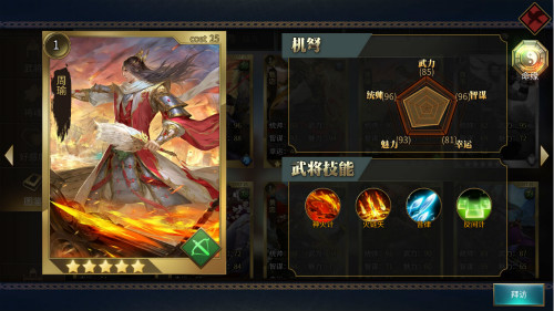 首先我们来看一下周瑜的五维属性,96点的初始智谋相当的高,在后期的五维培养中也是需要重点提升的属性,智谋的数值直接影响术功的数值。五维通过武将拜访中的拜师来提升,武将拜访的冷却时间通过赠礼来减少。
