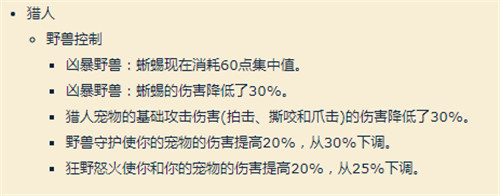 说到这个版本PvP强力职业推荐的时候,本来第一就想推荐猎人,但今天早上看到猎人被削的公告了。凶暴野兽蜥蜴的伤害降低了30%,猎人宠物的基础攻击伤害(拍击、撕咬和爪击)的伤害降低了30%等。看来暴雪为了游戏平衡连亲儿子都砍了,但是个人觉得即使这么砍了,猎人的PvP还是很强的(小声BB)。不知道有多少被猎人杀得起不来的同学快来举手示意下!