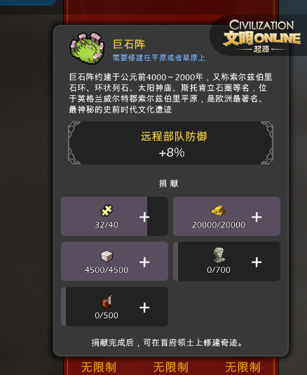 判断一个联盟的实力是否足够庞大,就要看它奇迹的数量和范围究竟有多广了。奇迹和文明一样,是每个文明的产物,每个奇迹的效果也不同,但是却可以加强联盟成员军队的战斗力。当联盟占领首府后即可在其中建造奇迹,但每个首府有且只能建造一个奇迹。修建有一定的条件限制,如:布达拉宫需要修建在丘陵上、巨石阵需要修建在平原或是草原上等。想要建造更多不同种类的奇迹,就需要不断地侵略占领首府,这样才能保证联盟蓬勃发展。
