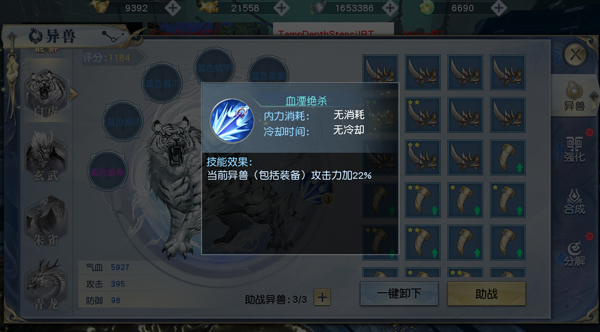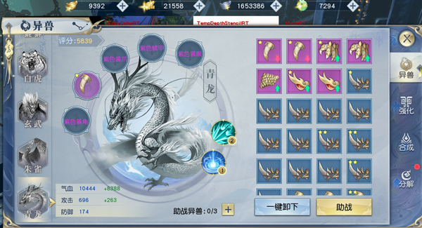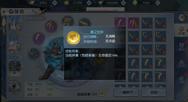不同的异兽能为主人提供不同的属性加成以及独特的技能,当然,越是强大的异兽需要的装备品质也就越高,如九尾妖狐只需要白色品质的装备即可激活,而青龙则需要至少紫色品质的装备才可以。