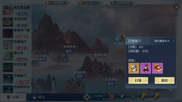 符傀巢穴以挑战闯关为主线,在规定时间内击败boss即可通关,只有少数通关评级达到最高评分“甲级”的道友才能进入下一关。关关难过关关过,通关的层次越高,则奖励越为丰厚。副本每天可以挑战两次,每次增加活跃度10。已经通关的副本层次,可以使用扫荡功能,快速获得奖励。