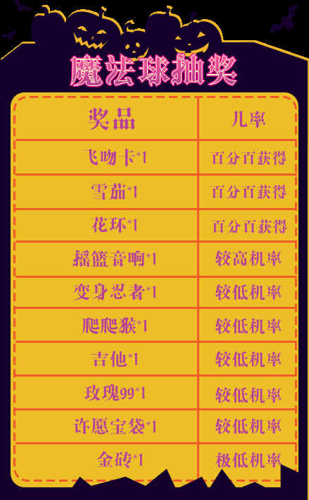 活动内容:活动期间,怪味浓汤、魔法骷髅、地狱小妖变身卡、地狱之门、天蝎座发言框、守护星光环、星空之翼、祈福宝袋、许愿宝袋加入魔法翻牌!