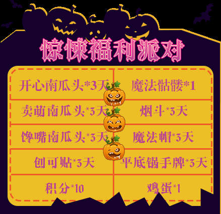 活动内容:活动期间,尝试万圣节的全新任务,感受紧张惊悚的派对魔力!所有万圣节任务每天都会重置,记得来完成哦!