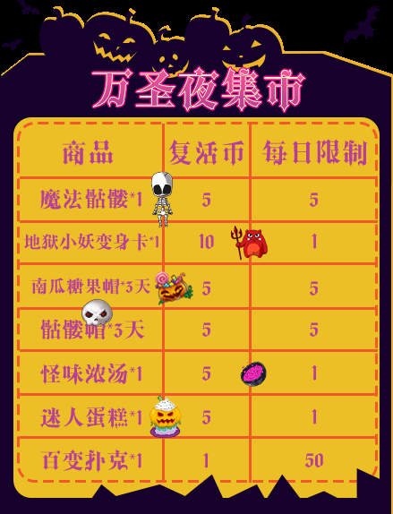 同时,每累计祈愿10次也可以获得1枚复活币,复活币可用于在“万圣夜集市”购买商品。