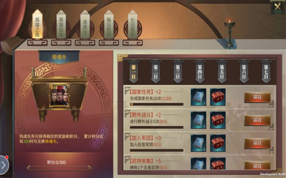 “英雄之路”活动伴随第二剧本开启,七天内主公可领取所有活动任务,任务不限时间,完成后不仅有任务奖励,且可以领取积分奖励,获得300积分可领取主公三选一邀请函!如此丰厚奖励,主公千万不可错过!