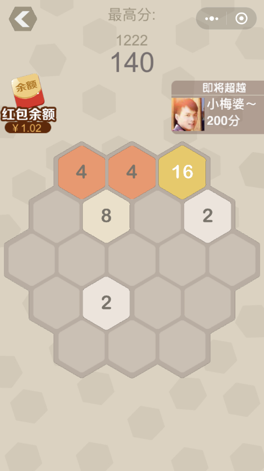 《2048新六角消除》另外一大特色就是我们加入了红包掉落系统,在你游玩的过程中,会有一定几率掉落数额1-100元不等的现金红包,在完成相应的简单操作后,红包的金额就会累计进你的积分器,积分到底一定数额后,就可以提现了!比拼人品的时刻,请务必让我也试试!