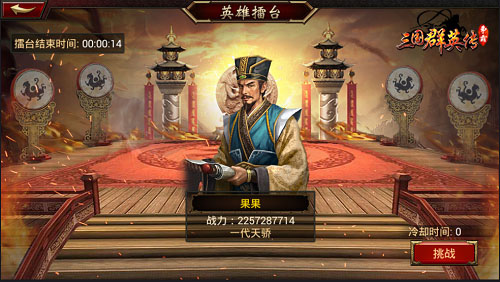 进入擂台,就意味着主公们进入了强者交锋,胜者为王的领域。点击右下角“挑战”按钮即可挑战擂主,挑战成功登顶擂主宝座;挑战失败也不用气馁,3分钟后即可满血再战。