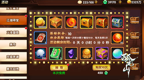玩家每日有三次免费寻宝的机会,超出则可花费50鹿玉购买1次寻宝机会和花费450鹿玉购买10次寻宝机会。寻宝的奖励十分丰厚,玩家有几率获得金奖礼包、紫将礼包和各种装备宝箱。另外,每次参与寻宝都可获得10积分,累计的积分还可兑换神秘宝箱。