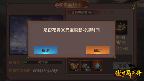 当然,借箭也并非零难度,各位英雄每次借箭之后,都会有冷却时间,每只箭增加2分钟。不过,在冷却时间累积超过30分钟后,玩家可以消耗元宝将冷却时间消除,这样就能加速完成目标了。值得注意的是,每次借箭成功,都会有对应的固定奖励可领取呢!