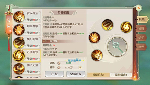 “佛法无边”,以自身为中心对四周进行群伤,旋转但木有跳跃,伤害几乎是一技能的两倍,战力大幅提升;