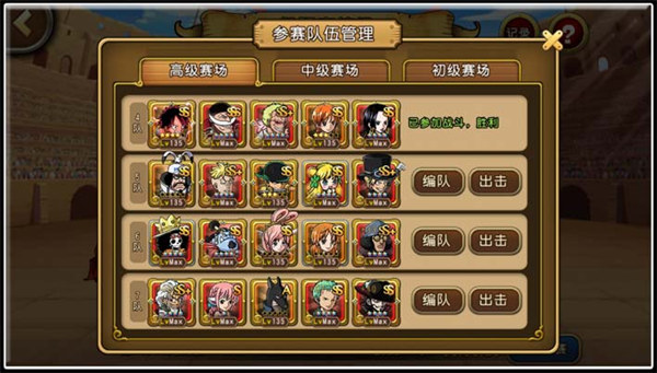 1、优先高级。前文说过,高级场的收益率是最高的,一旦获胜,除积分外还有10倍敌方战力的贝里。相比之下,下图中这种阵容打初级场,即使全胜,又能获得多少收益呢?