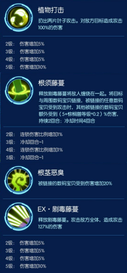 它的必杀是对连接的数码宝贝造成跟等级挂钩的伤害,没连接的则无法触发。被动使被连接的数码宝贝额外受到20%的伤害。因为必杀连接伤害跟等级挂钩,所以推荐前期40级,后面有能力了升50级,跟梗犬、加鲁哥一样,把必杀技能升级,吃到5级,减少冷却回合。