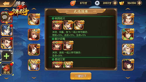 西蜀英雄无数,该如何知人善任呢?根据上阵的英雄来搭配相应的武将,便可激活情缘,实力大涨。如张飞、刘备、关羽一起,可为全队提升物攻、法攻、生命各15%的数值;庞统、魏延、刘备一起,可为全队提升物攻、物防、法攻、法防各15%的数值。即便等级不占优势,依旧能依靠策略的排阵,反败为胜,拿下最终胜利。