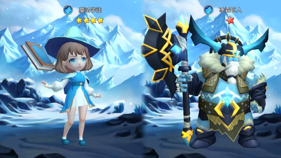 最后是来自冰系阵营的魔法学徒和冰霜巨人,就像《雷神》中的奥丁和洛基一样,小学徒是冰霜巨人收养的女儿,这也是为什么小学徒没有冰霜巨人那样蓝色的皮肤。虽然没有血缘关系,但是冰霜巨人对小学徒的父爱也从不缺席。