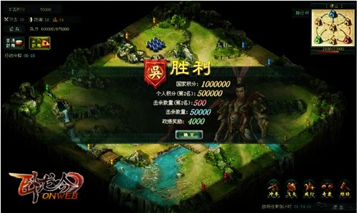 国战即魏蜀吴三国之战,进入国战地图后,蜀国玩家出现在大本营成都,魏国玩家出现在大本营许昌,吴国玩家出现在大本营建业。一切准备就绪,开战!地图内除三座大本营外,还有四个中立城市,我们要做的就是攻破敌方和中立的所有城墙,提高自己的攻防能量,获得胜利。