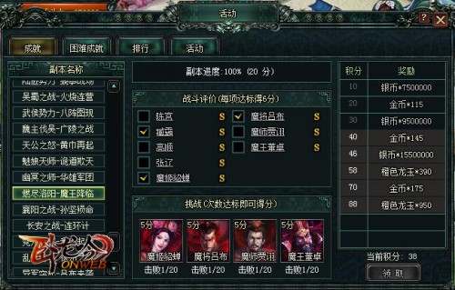 每个副本都设有一个成就栏,包括四个部分:完成度、战斗评价、挑战、积分奖励。完成度是指全通副本地图以及完胜副本军团;战斗评价要求比较高,玩家们与boss战斗后评分达到要求才能得分;挑战需要玩家多次战胜boss;积分奖励,便是大家最想得到的通关好礼啦,不过也是有分数限制的!