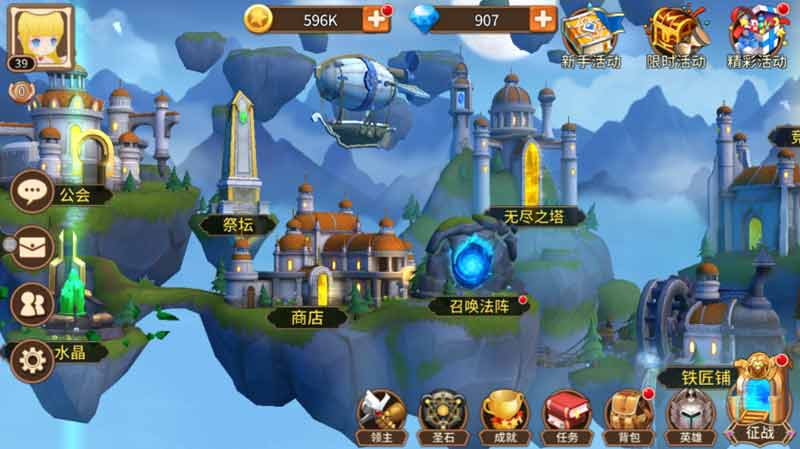 ↓多层次主城,用多个平面营造出3D效果,既简洁又让玩家更有代入感!建筑风格主要为欧美风,整体造型和环境都充满了魔幻气息。