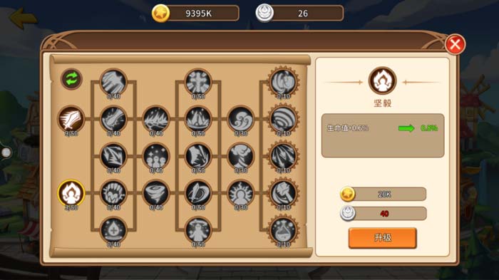 在科技树里,玩家可以选择基础的属性来升级,攻击、暴击、生命、格挡、防御等都可以提升,为全体英雄增加基础属性;还可以根据自己想要重点培养的英雄,选择不同的职业进行升级,例如增加战士生命值、增加法师攻击、增加刺客速度等,有针对性的提升你的战力!