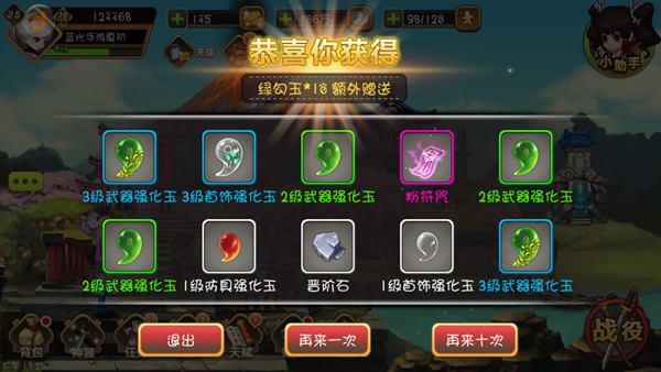 蓝勾玉抽取需要消耗银币,每24小时为玩家免费一次十连抽,比较便宜,抽取中可以获得蓝色品质装备或者强化玉,也有几率出紫色曲玉。。不过这种十连抽只能抽取2次。