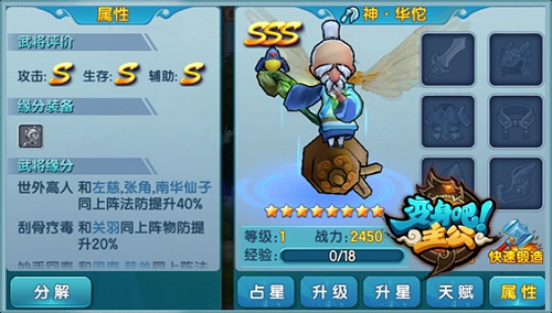 《变身吧主公》最大的特色武将变身将迎来重大升级,在原来四大形态变身的基础上,特定的武将再获得全新的觉醒形态。觉醒之后,气血、物攻、物防、法攻、法防和暴击属性都有所增加,而且有的武将从SS变成了SSS,实力上有了质的飞跃。
