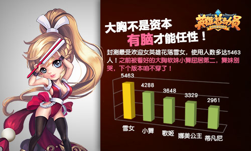 首次封测“最受欢迎女英雄”非雪女莫属,其使用人数多达5463人!之前一直被看好的大胸软妹小舞屈居第二。舞妹别哭,下个版本咱们再战!