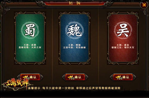 《三国战神》”周年庆。三国侠义”版本的上线或将引发一场大量英雄的移民风潮,新版本中的“转国”玩法,将允许非国王、非候选人、无帮会的玩家从强国投身较弱的国家,展开一场更具挑战的扶持国家的侠义之举,从较弱的国家重新来过带领一个较弱的国家走向强国之列。