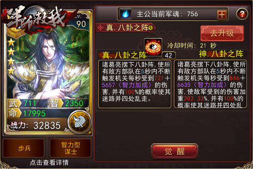 版本更新后,会在原有的升技界面加入觉醒按钮,但技能觉醒的前提是橙卡武将需进阶到3星或4星。3星可将技能升级到“真”,4星可将技能升级到“神”。觉醒后的武将技能,不仅能提升伤害,还能获得额外的觉醒效果,与原始技能相比也有了质一般的飞跃。以武将“诸葛亮”为例,主动技能八卦之阵升级到“神”后,除了会增加伤害,还将加重敌军高达282.33%的伤害,主动技能将变成逆天神技!