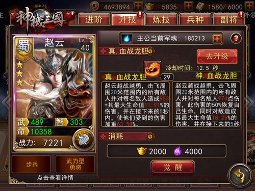 三星赵云可以将主动技能“血战龙胆”觉醒为“真。血战龙胆”,能击飞周围20米范围内所有敌人,并对每个敌人造成953点伤害,外加敌人生命值的11.91%,在接下来的5秒还能使敌人受到的伤害加重63.58%。当赵云进阶到4星后,就能觉醒为“神。血战龙胆”,这时,技能不仅能增加对敌人的伤害,还可以用敌人的伤害恢复自己的生命值,简直是逆天神技!