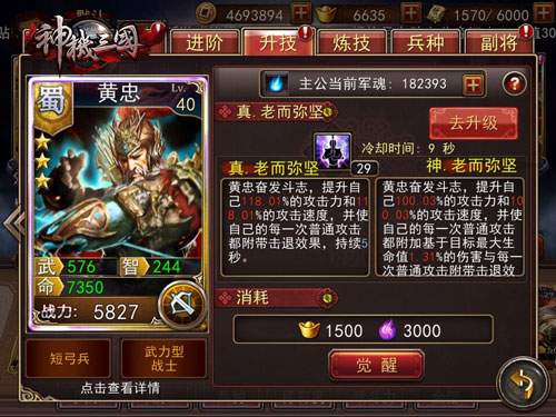 忠义黄忠觉醒后的技能变为“真。老而弥坚”,虽然黄忠的战力相对比同等级的其他五虎稍低一些,但他的技能效果也是不容忽视的。进阶到四星以后,技能可以觉醒为“神。老而弥坚”,能提升自己的攻击力和攻击速度,同时还能对敌人造成其最大生命值1.31%的伤害。